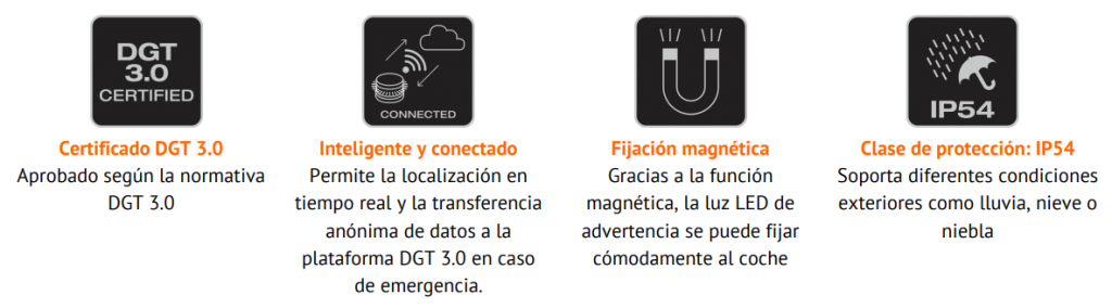 La baliza V16 Conectada será el único dispositivo de preseñalización de peligro autorizado en España a partir del 1 de enero de 2026, sustituyendo de esta forma a los triángulos de emergencia. Tiene una doble función. Por un lado, avisa a otros conductores mediante una luz intermitente de alta intensidad sobre la presencia de un vehículo detenido. Por otro lado, comunica la ubicación del vehículo a la plataforma de vehículo conectado DGT 3.0 para su información en tiempo real, tanto en los paneles de mensaje variable de la carretera, como a través de los navegadores que incorporan el resto de los vehículos.